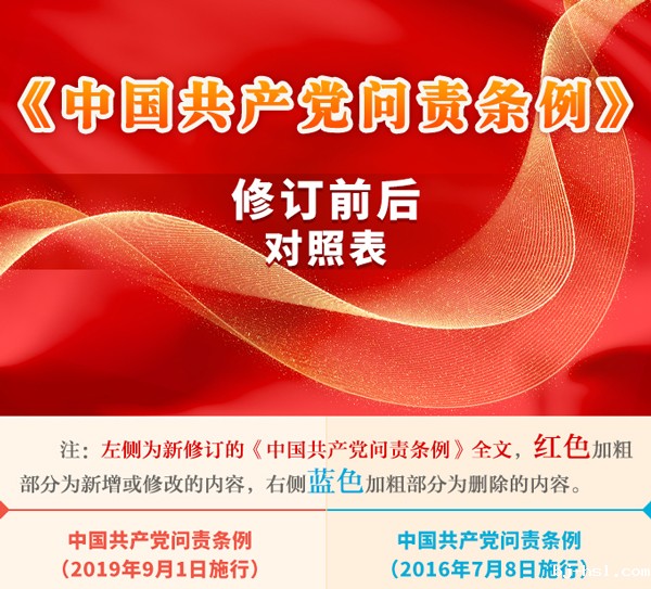 近日,中共中央印发了修订后的《中国共产党问责条例》(以下简称《条例》),并发出通知,要求各地区各部门认真遵照执行。修订后的条例自2019年9月1日起施行。2016年7月8日中共中央印发的《中国共产党问责条例》同时废止。