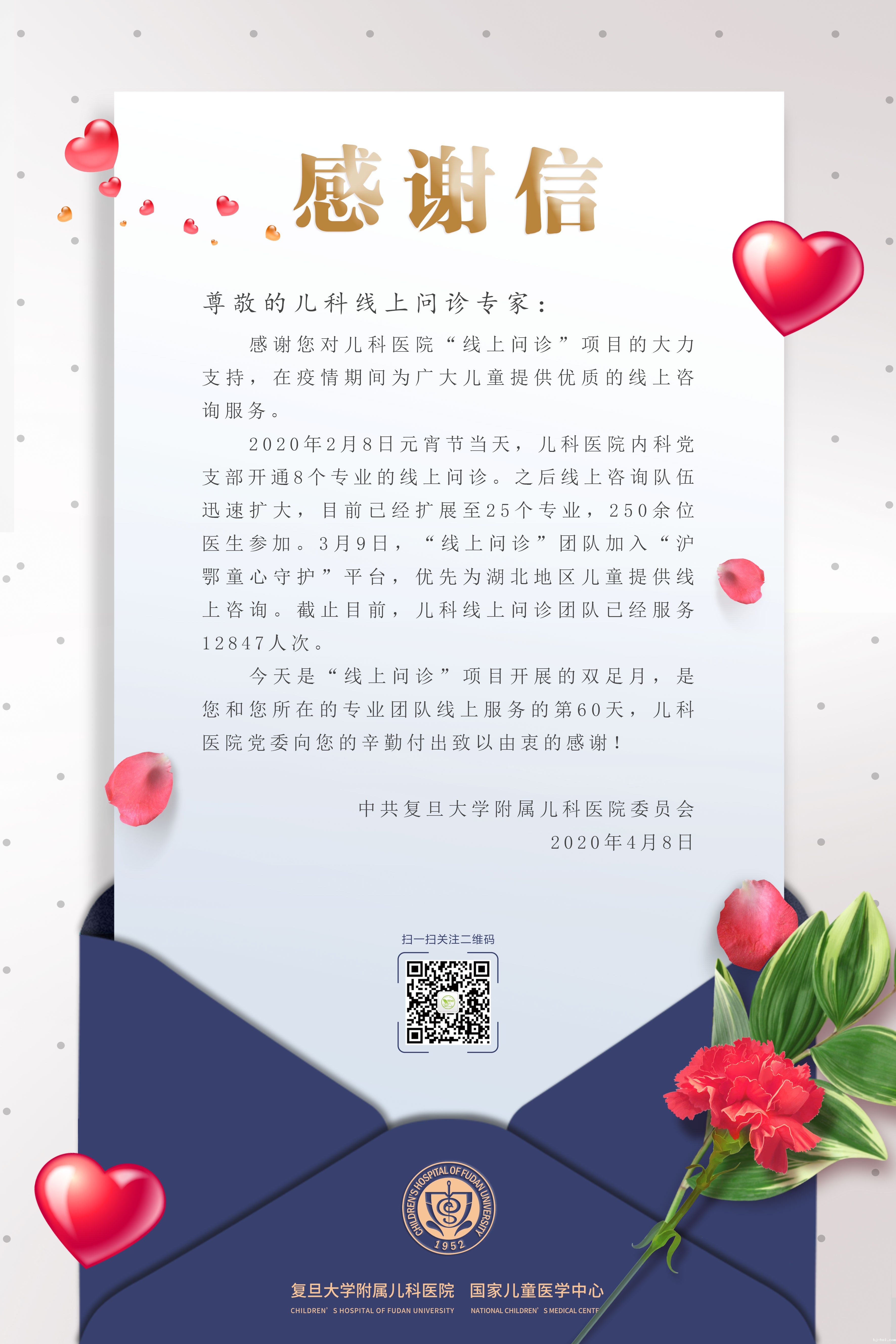 今天是“线上问诊”项目开展的双足月,儿科党委专程致信感谢儿科线上问诊专家对儿科医院“线上问诊”项目的大力支持,在疫情期间为广大儿童提供优质的线上咨询服务。