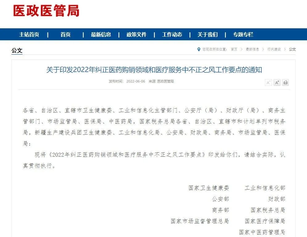 近期,国家卫生健康委员会、工业和信息化部、公安部、财政部、商务部、国家税务总局、国家市场监督管理总局、国家医疗保障局、国家中医药管理局等九部委联合印发了《关于印发2022年纠正医药购销领域和医疗服务中不正之风工作要点的通知》(国卫医函〔2022〕84号,纠正医药购销领域和医疗服务中的不正之风,着力解决群众反映强烈的突出问题。