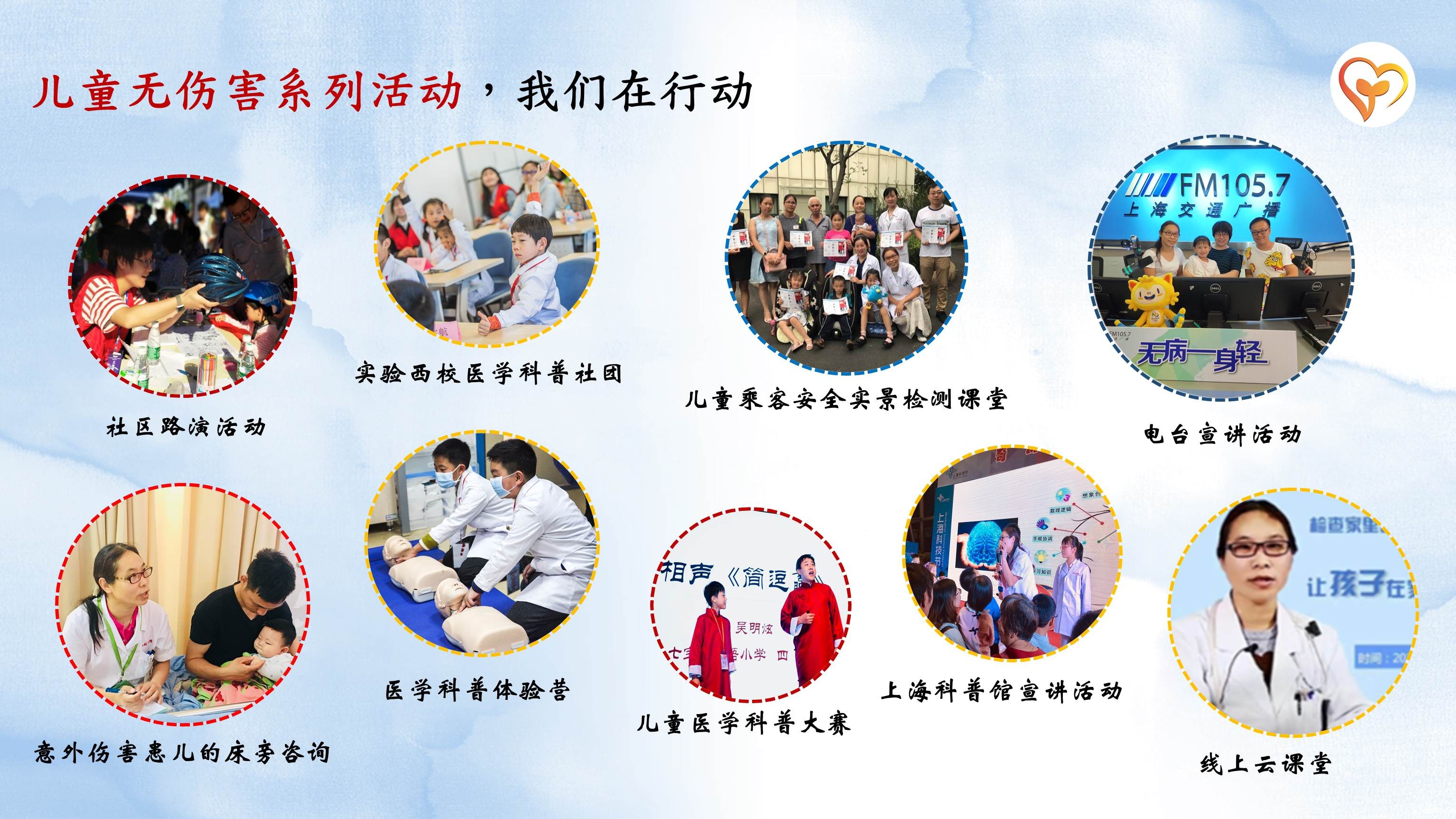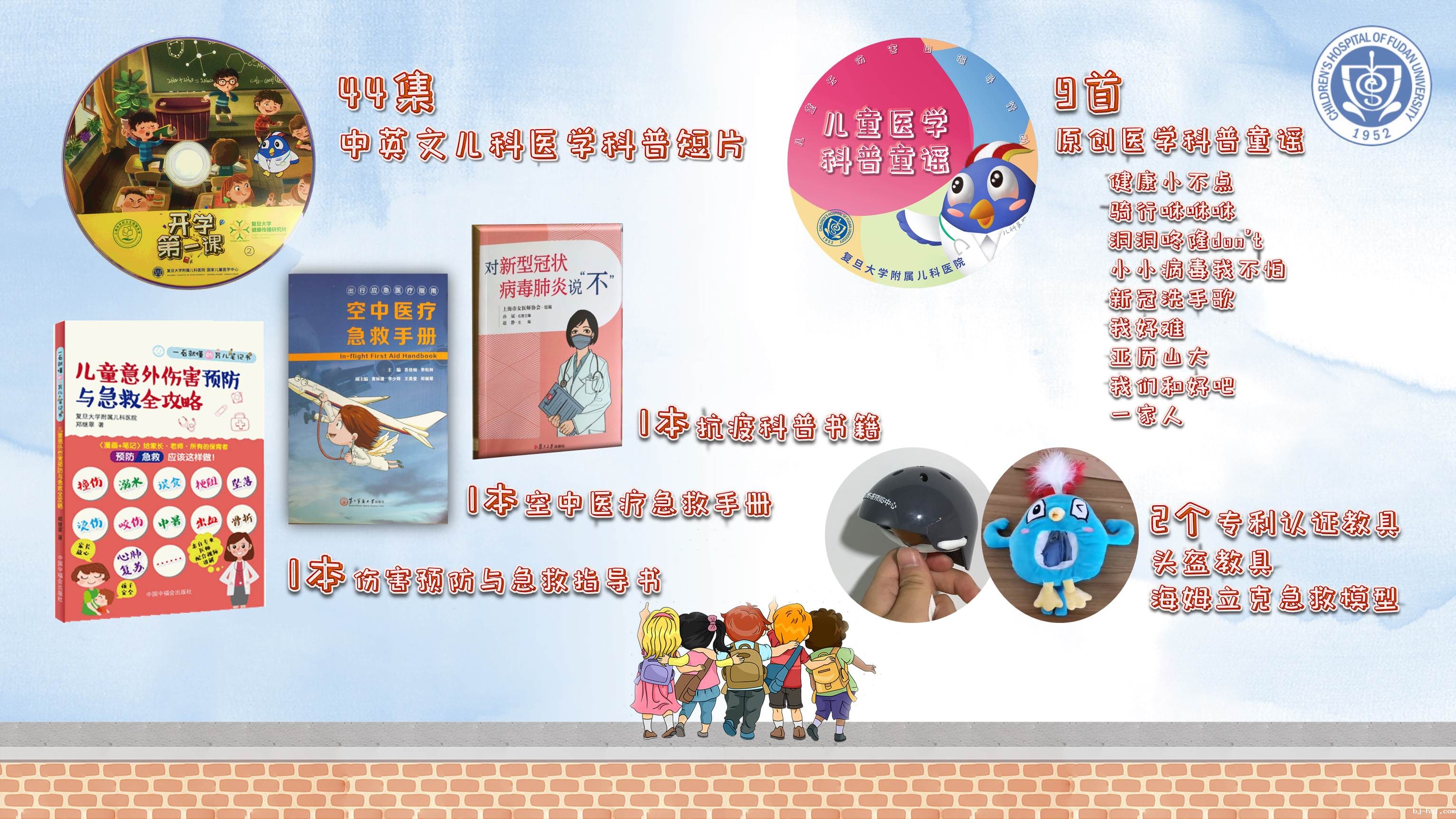 自青年志愿服务团队成立以来,共开展300余场线下科普宣讲;30余场电台、电视宣传,拍摄短视频44部;开辟两个专栏(微信科普专栏、“为了孩子”杂志特邀撰稿专栏);创作科普歌曲9首(《健康小不点》、《骑行咻咻咻》、《洞洞咚隆,Don’t》、《小小病毒我不怕》、《新冠拍手歌》、《我好难》、《亚历山大》、《一家人》、《我们和好吧》);撰写3部科普书籍(《儿童意外伤害预防与急救全攻略》、《空中急救手册》(副主编)、《对新型冠状病毒肺炎说“不”》(副主编));撰写科普文章40余篇(《为了孩子》特邀撰稿),开展儿童伤害预防线上科普宣教,成功构建一套成熟的儿童伤害预防与急救课程与课件;研发教具2个。线下受益人次超3235人次,线上受益人次超1.2亿余。媒体报道150余次,获得各类科普比赛及上海市志愿者服务奖项,社会效应显著。