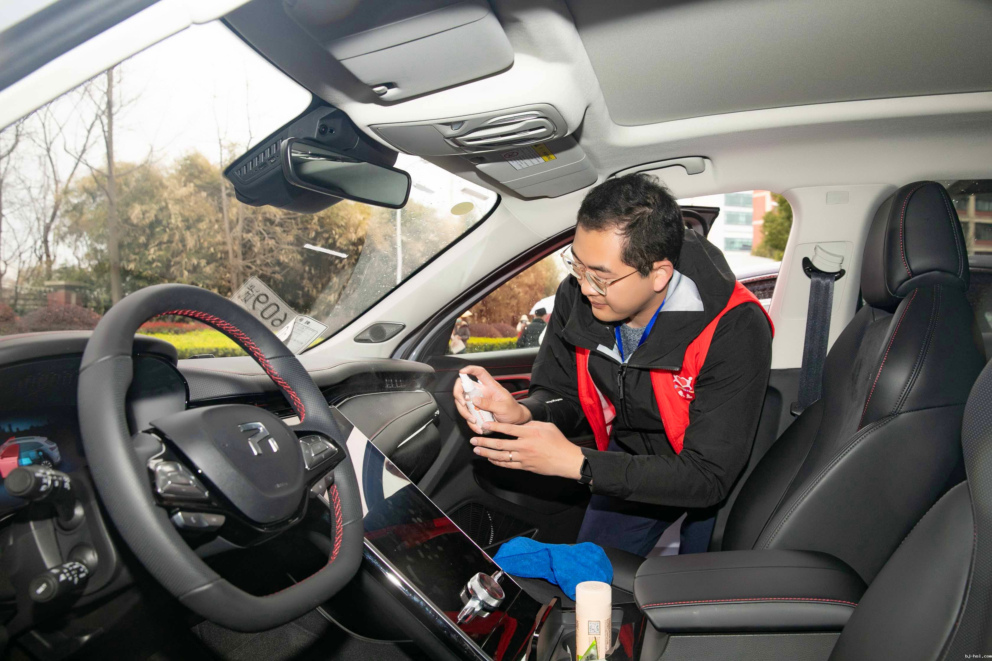 8:00,车辆出发前,每位上汽乘用车青年爱心车主均对车辆进行仔细的消毒杀菌,同时爱心专车内集成在空调中的紫外线光学杀毒系统让汽车空调具备消毒灭菌的防护效果,为整个护送过程提供双保险。