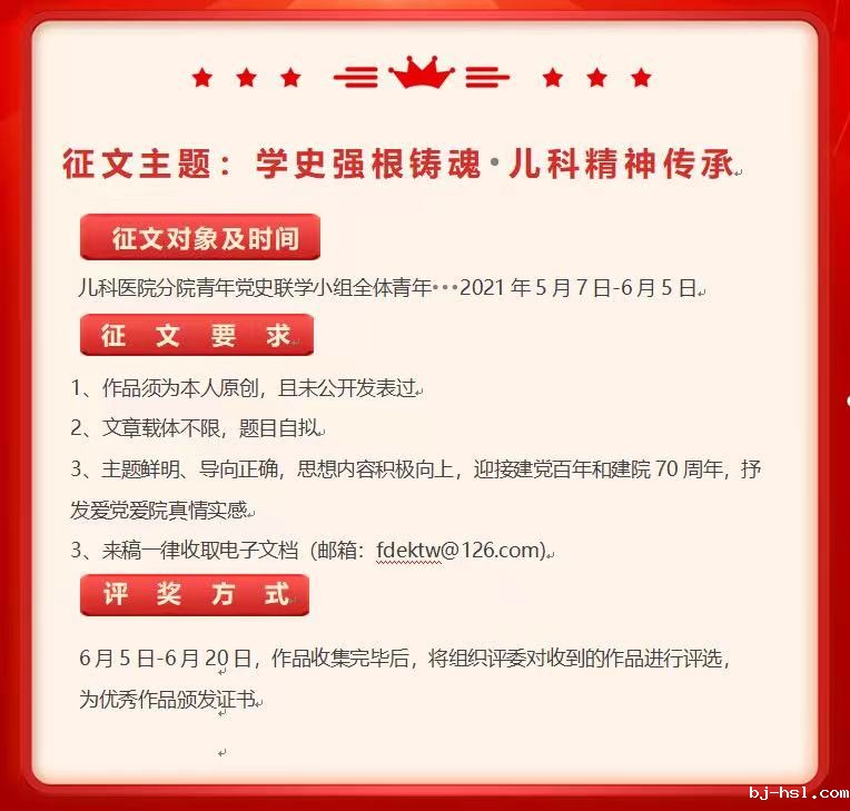 为深入学习贯彻习总书记在党史学习教育动员大会上的重要讲话精神,儿科医院分院青年党史联学小组于5月中旬组织开展“学史强根铸魂 儿科精神传承”主题征文活动,共同推进党史学习教育在儿科医院各分院扎实开展,一同学史明理、学史增信、学史崇德、学史力行。