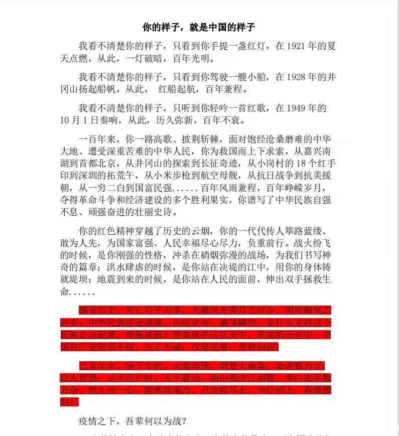 2021年7月1日,党的历史上又一个光辉时刻,习总书记的讲话,回顾了中国共产党成立100年来团结带领中国人民走过的波澜壮阔的历史进程和做出的彪炳史册的丰功伟绩,内容视野宏阔、气势磅礴、精辟深刻、内涵丰富、振奋人心,教导我们不忘初心,砥砺前行,充分展现了中国共产党人的初心使命和历史担当。中国共产党是历史和人民的选择,没有中国共产党就没有新中国。