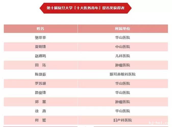 JJB竞技宝平台登录入口“十大医务青年”荣誉设立于2001年,每两年评选一次,旨在选树优秀医务青年榜样,打造复旦医务青年品牌,鼓励医务青年积极进取,不断完善自我,力争上游。