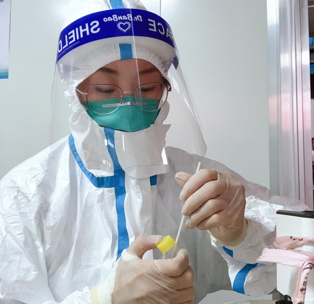 我院核酸采样点要面对整个社会面的核酸采样工作,日均采样量1700人次,我主要负责指导被采样人员如何自助申请核酸检测,提高采样的效率。同时我还负责门诊就医病人及家属、院内员工以及其他采样点采样工作。虽然每天不停地奔波于各个核酸采样点,不停地穿脱防护服,防护服内的衣衫始终都是湿答答的,N95口罩下也是深深的勒痕,但我觉得这些都是我战斗后的荣耀。