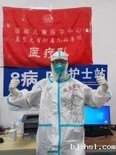 作为一个分别去过上海公共卫生中心、仁济定点医院和本院院中区“经验丰富”的抗疫护士来说,在得知海南三亚疫情加重需要助力的时候,我积极响应号召、配合领导部署,前往三亚抗疫第一线。这里的工作模式及流程还是与以往上海的收治新冠的病房有所不同,三亚高温、湿度大的环境也造成了一些困扰和不适应,每一次工作后出舱都汗如雨下,但我们没有抱怨,因为信念所在、心之所向,让我们一往无前,无所畏惧。闲暇之余我也会发挥自己的擅长,在防护服上画上一些卡通人物、涂上艳丽的色彩,让小朋友们对大白感到更加亲切与信任,并带领小朋友们一起画画,使患儿们在方舱内的隔离生活多一点乐趣、多一点美好的回忆。没有一个冬天不可逾越,没有一个春天不会来临。爱和希望的播撒,定比病毒蔓延得更快。