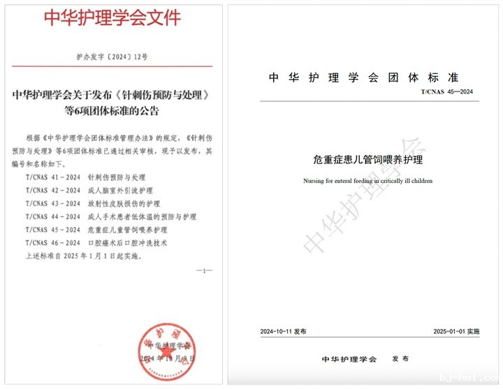 2024年10月16日,中华护理学会官网上发布6项团体标准公告,其中包括了由我院护理部顾莺主任牵头制定的T/CNAS 45-2024《危重症儿童管饲喂养护理》团体标准(以下简称《标准》),为中华护理学会发布的首个儿科护理相关团体标准。
