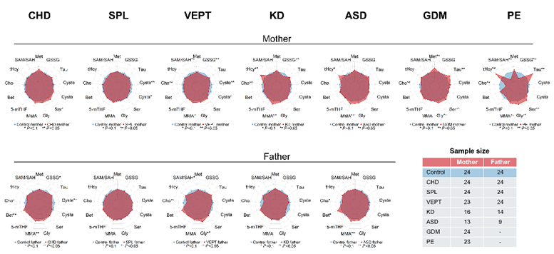 本研究基于前瞻性SPCC队列经过科学设计分析了171位母亲和119位父亲在孕前采集的血液样本中22种一碳代谢相关代谢物,涵盖先天性心脏病(CHD)、极早产/非常早产(VEPT)、自然流产(SPL)、川崎病(KD)、孤独症谱系障碍(ASD)、妊娠期糖尿病(GDM)和子痫前期(PE)共7种母婴疾病结局。所有病例组均匹配了一个年龄和体重指数相近的共享对照组。