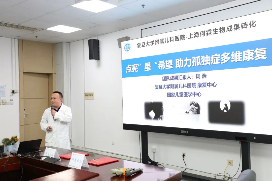 随后,周浩主任代表科研团队汇报了转化成果的研发历程。他系统介绍了其团队十年磨一剑的科研历程:该成果始于导师王艺教授引领下的儿童孤独症全国多中心流行病学调查;后经过多年积累,通过系列的临床和基础研究发现孤独症患儿存在代谢组学异常,筛选出具有高特异性和灵敏度的生物标志物组合;近年来开展孤独症营养干预的临床试验,基于中医药食同源理论研发功能食品;以及拟牵头制定行业专家共识。该成果的成功转化将助力儿童孤独症多维康复干预。