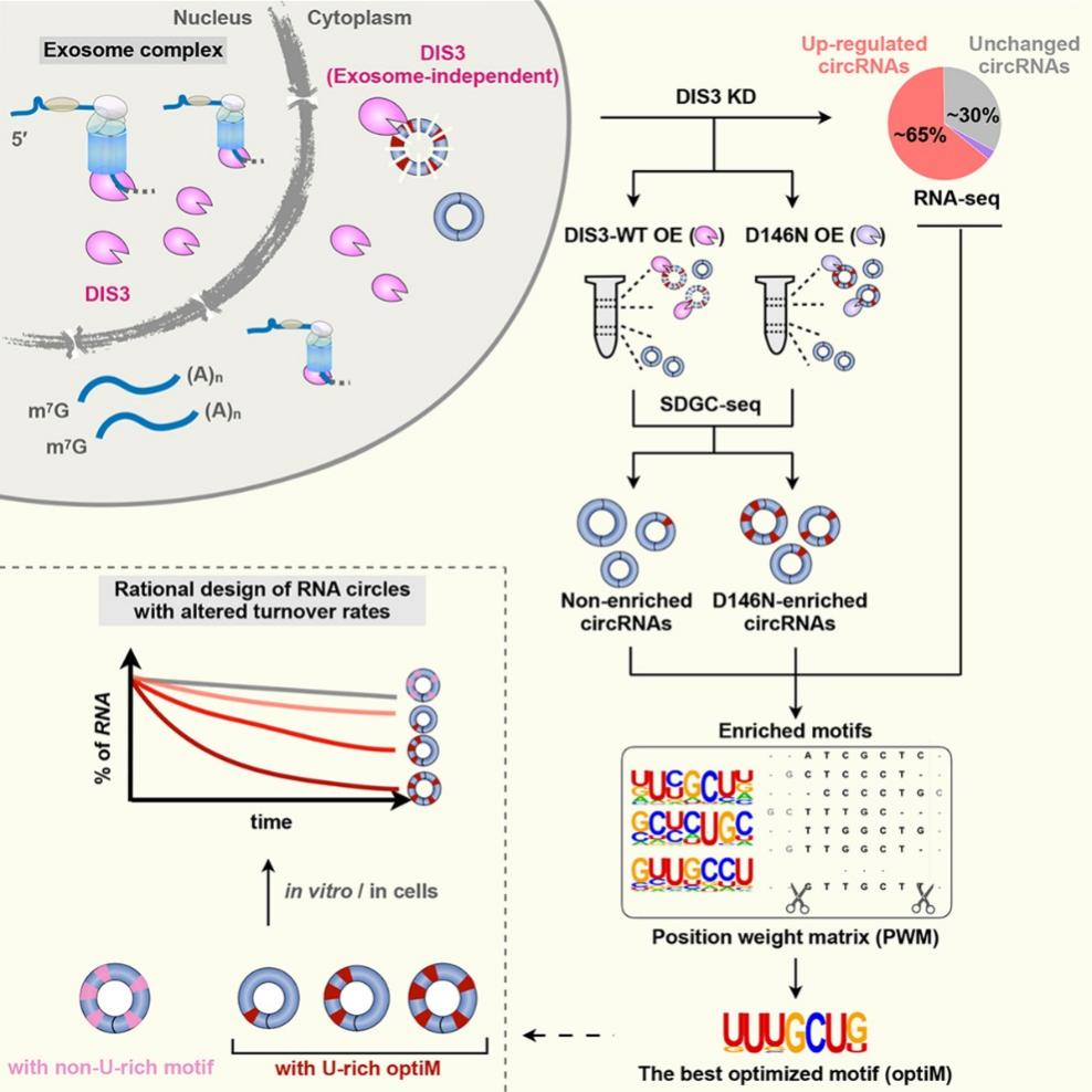 环形RNA主要由mRNA前体外显子反向剪接而成,具有区别于线性RNA的生成加工、转运代谢及功能发挥途径与调控规律1,2。已知在应激条件下,双链RNA病毒激活核酸酶RNase L可以导致环形RNA大规模降解3。然而正常条件下,仅有个别含m6A修饰或具特殊结构的环形RNA可以被降解4。因此,正常条件下环形RNA代谢稳态维持的分子机制尚不清楚。