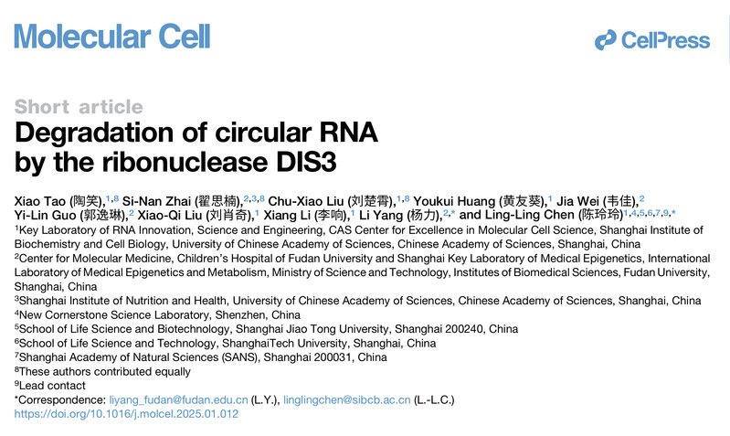 2025年2月17日,竞技宝app官方/JJB竞技宝平台登录入口生物医学研究院杨力研究组与中国科学院分子细胞科学卓越创新中心(生物化学与细胞生物学研究所)陈玲玲研究组在《Molecular Cell》期刊上发表了文章“Degradation of circular RNA by the ribonuclease DIS3”。该研究解析了生理条件下环形RNA被核酸内切酶DIS3监控降解的新机制,实现了对环形RNA“生老病死”过程中特异调控及分子特征等基础研究的闭环。
