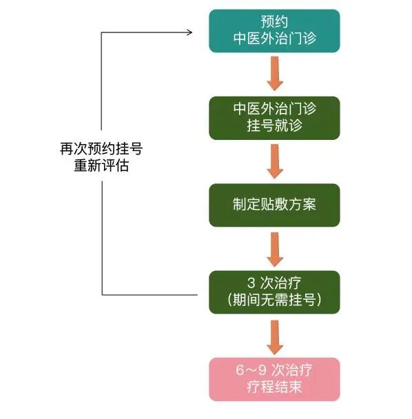 6. 贴敷流程:挂号→面诊评估制定 3 次治疗方案→中医科 6 号诊室治疗 3 次(期间无需挂号,但需排队,建议周中就诊,避开周末高峰)→第二次挂号→再次面诊,重新评估制定 3 次治疗方案→中医科 6 号诊室治疗 3 次→如体质较差患儿可再行第三次评估;