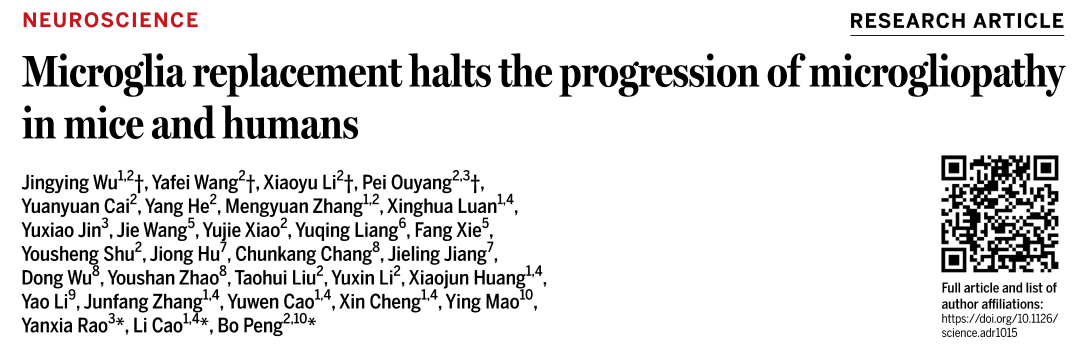 2025年7月10日,竞技宝app官方与上海交通大学医学院附属第六人民医院等的联合研究团队在《Science》期刊上发表了突破性成果:通过替换中枢神经系统中的致病性小胶质细胞,成功阻断了CSF1R相关脑白质病(ALSP)在动物模型中的病程进展。该研究还首次揭示,由于携带CSF1R致病基因突变,传统骨髓细胞移植(tBMT)在ALSP特定病理背景下,机制上等效于该团队开发的小胶质细胞替换技术Mr BMT,能够实现高效小胶质细胞替换和神经功能改善。在此基础上,团队进一步开展了临床治疗研究,并在为期两年的随访中证实了该方法能够有效阻止ALSP患者病情恶化。这项成果是迄今唯一经临床验证有效并获得机制验证的ALSP治疗方案,标志着我国在小胶质细胞替换领域持续处于国际领先地位。
