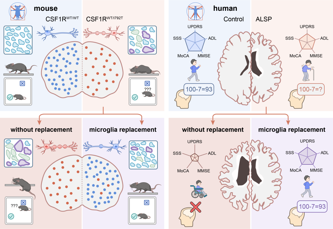 成人起病轴突膨胀伴色素胶质细胞脑白质病(adult-onset leukoencephalopathy with axonal spheroids and pigmented glia, ALSP)是一种由CSF1R基因突变引发小胶质细胞功能障碍的遗传性白质脑病。患者通常在成年后发病,病情进展迅速,主要表现为小胶质细胞数目减少、脑白质广泛脱髓鞘、轴突肿胀、轴索球样变、脑钙化、认知障碍和进行性运动能力退化,最终导致严重神经功能丧失。在我国,ALSP在患者临床发病后的平均生存期仅为3年左右,至今尚无有效的临床方案可以治疗或减缓该疾病的发生发展。