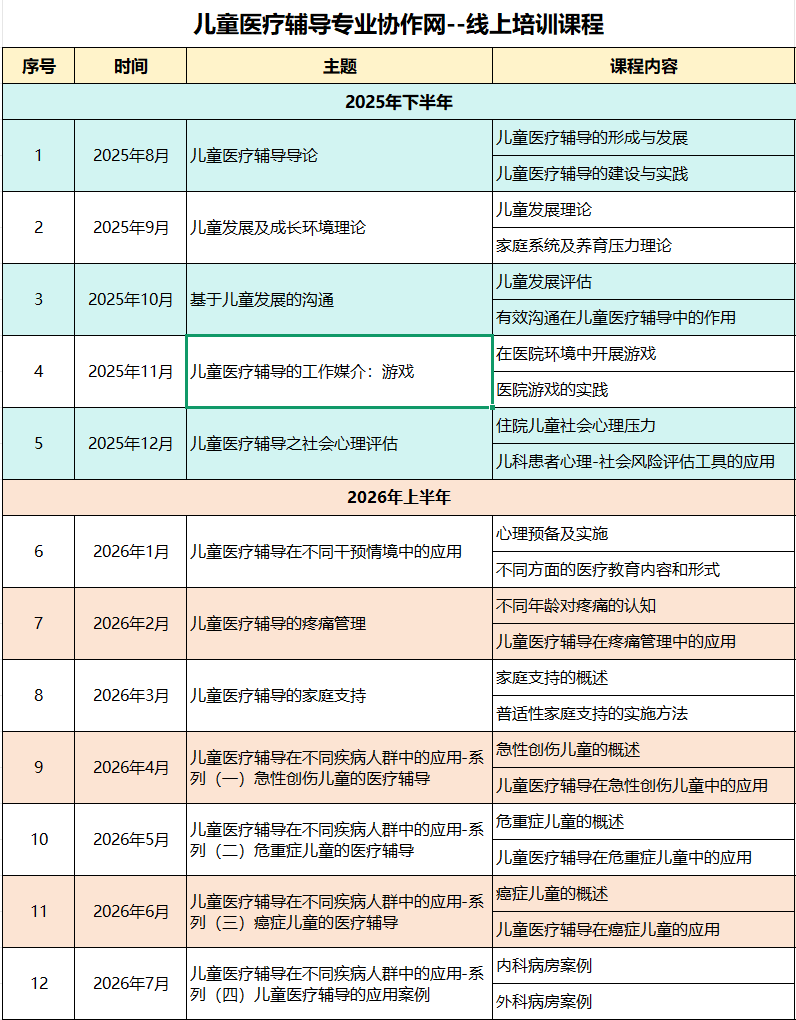 为全面提升儿童医疗辅导服务质量,推动行业规范化发展,我们将面向全国兄弟单位,推出为期一年的儿童医疗辅导系列线上培训课程,为儿童打造更温暖、更安全的医疗环境!