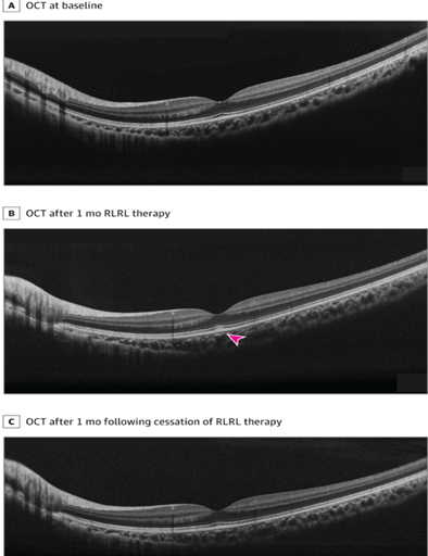 该研究还首次报道,接受重复低强度红光照射治疗组中,3名儿童的3只眼(7.0%)在随访期间观察到眼底特征性OCT改变,表现为黄斑中心凹椭圆体带和色素上皮层间的高反射信号,但不伴有矫正视力下降或异常视觉表现。这些儿童在停止红光照射后,异常高反射信号在0.5~3月间自行消失。