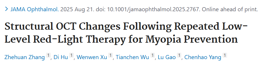 2025年8月21日,竞技宝app官方眼科杨晨皓主任团队在眼科顶刊《JAMA Ophthalmology》(中科院一区,IF=9.2)在线发表儿童近视防控最新研究成果,题为:Structural OCT Changes Following Repeated Low-Level Red-Light Therapy for Myopia Prevention。该研究首次报道了使用重复低强度红光进行近视防控治疗的儿童,发生特征性视网膜结构变化的光学相干断层扫描(OCT)表现,强调了在使用重复低强度红光期间常规进行OCT检查的重要性。本文第一作者为眼科主治医师章哲环和胡磾,通讯作者为眼科杨晨皓主任和高路医生。