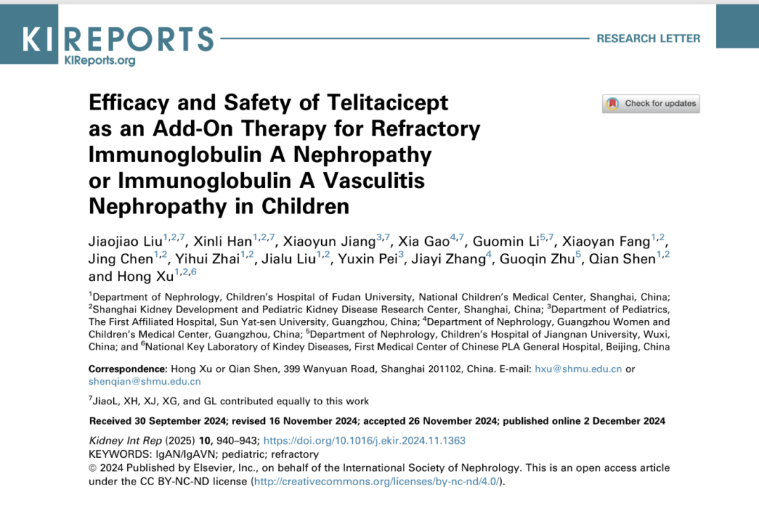 3. Efficacy and Safety of Telitacicept as an Add-On Therapy for Refractory Immunoglobulin A Nephropathy or Immunoglobulin A Vasculitis Nephropathy in Children. Kidney Int Rep. 2024 Dec 2;10(3):940-943. doi: 10.1016/j.ekir.2024.11.1363.