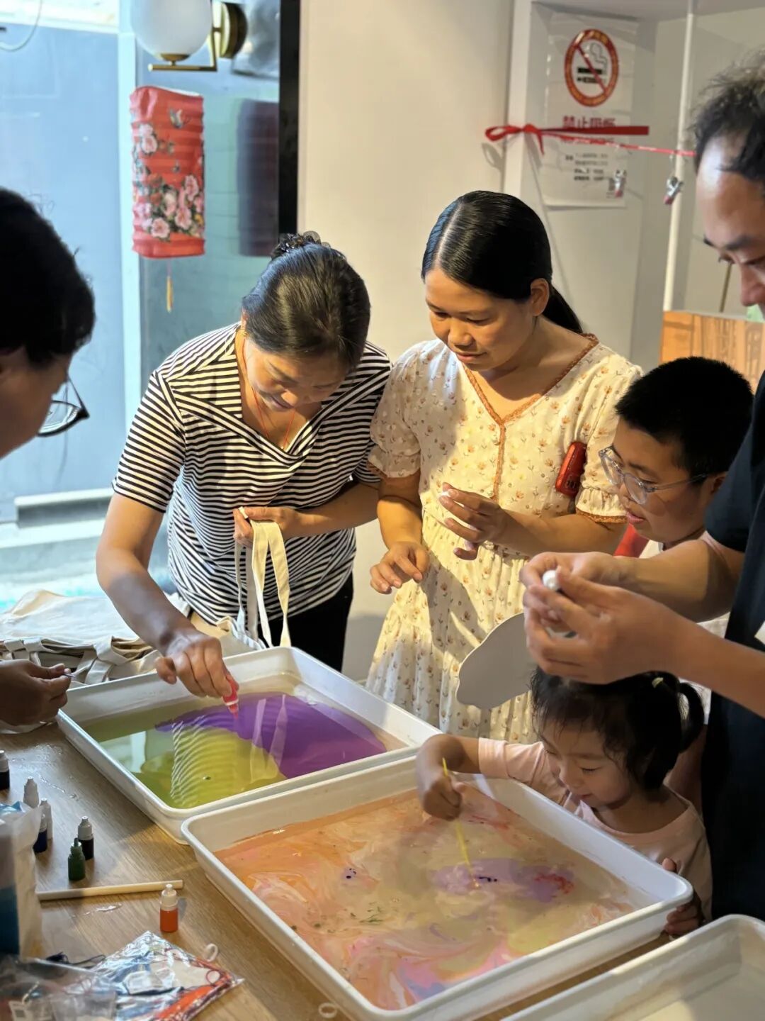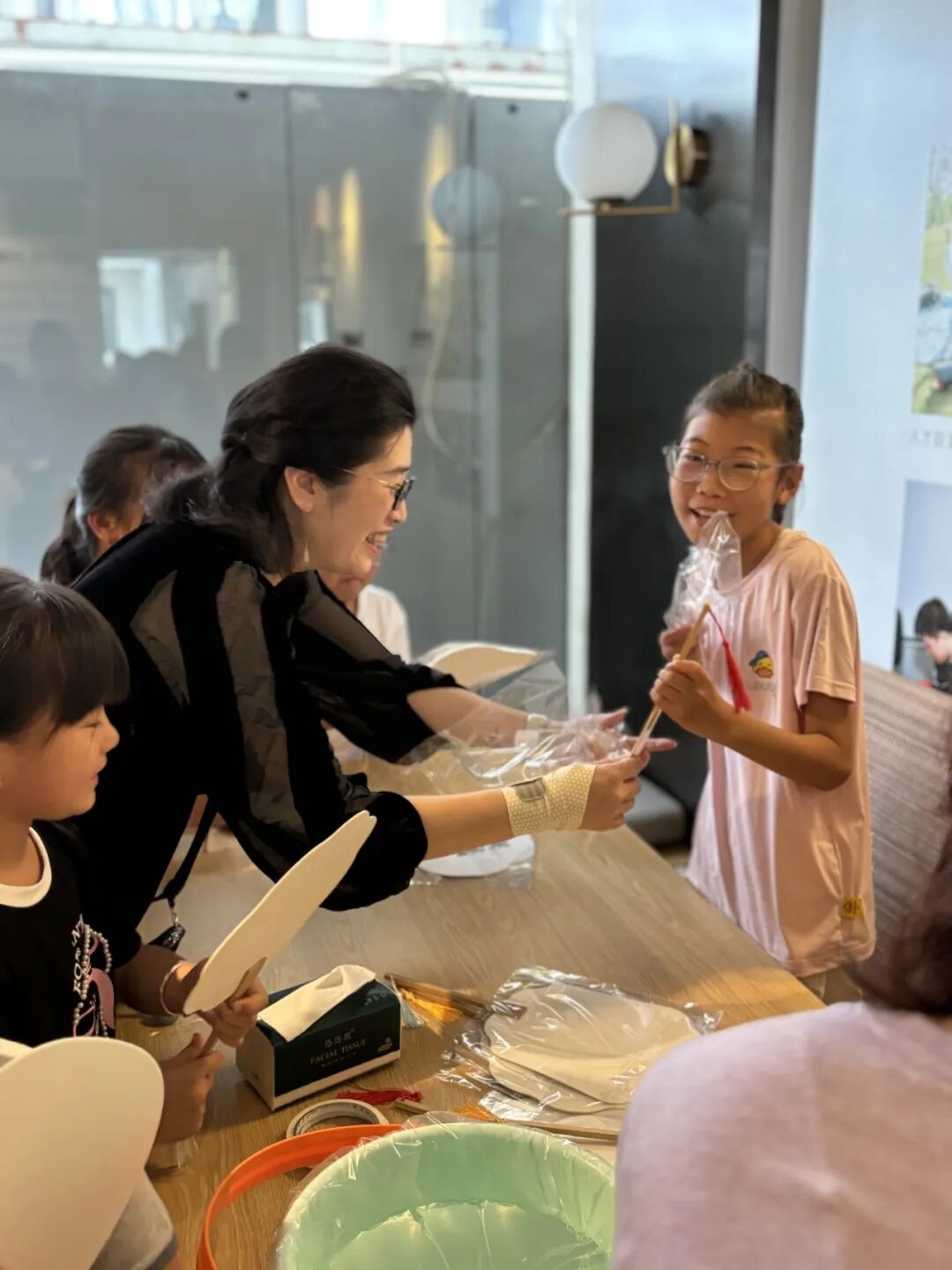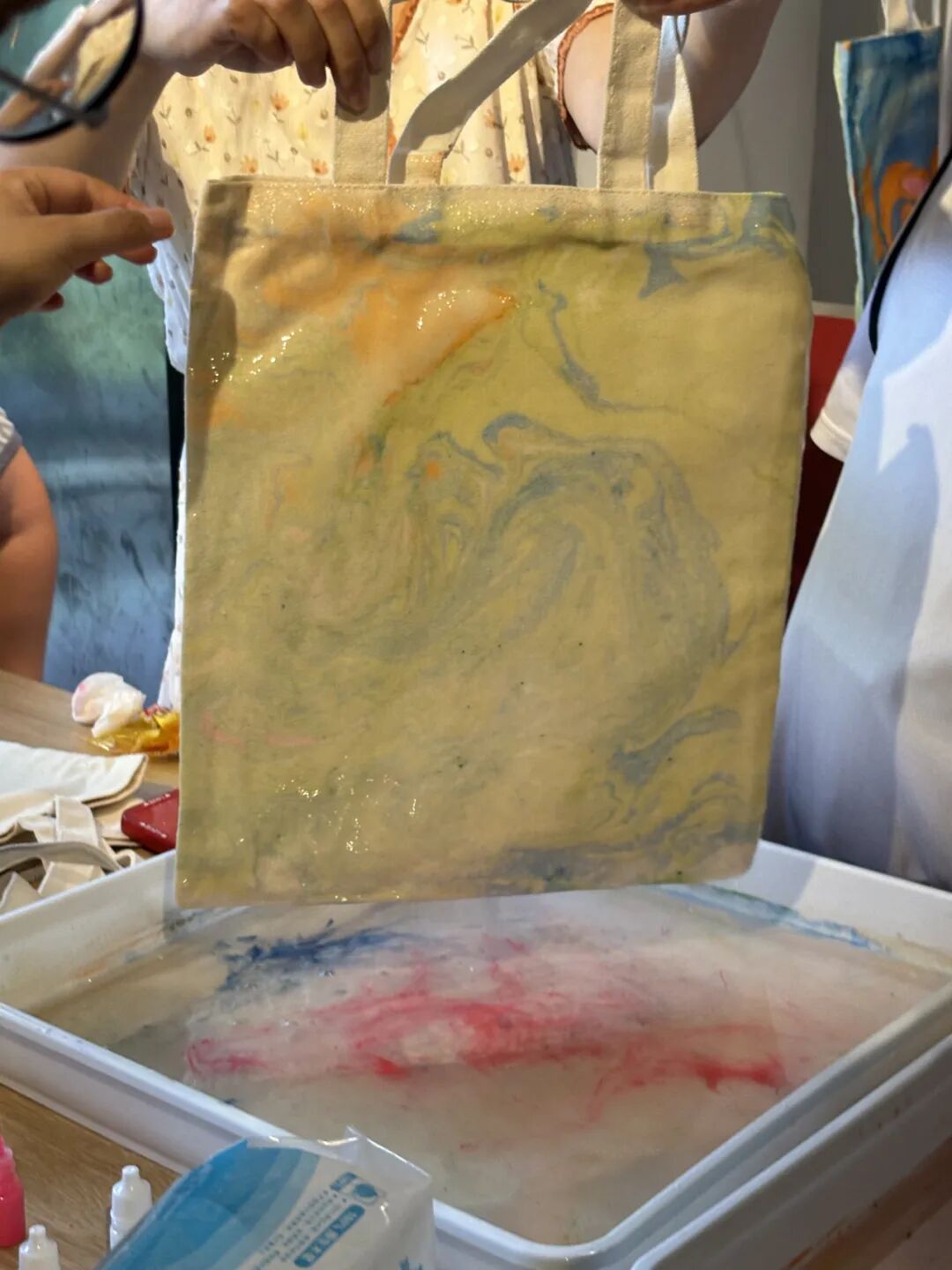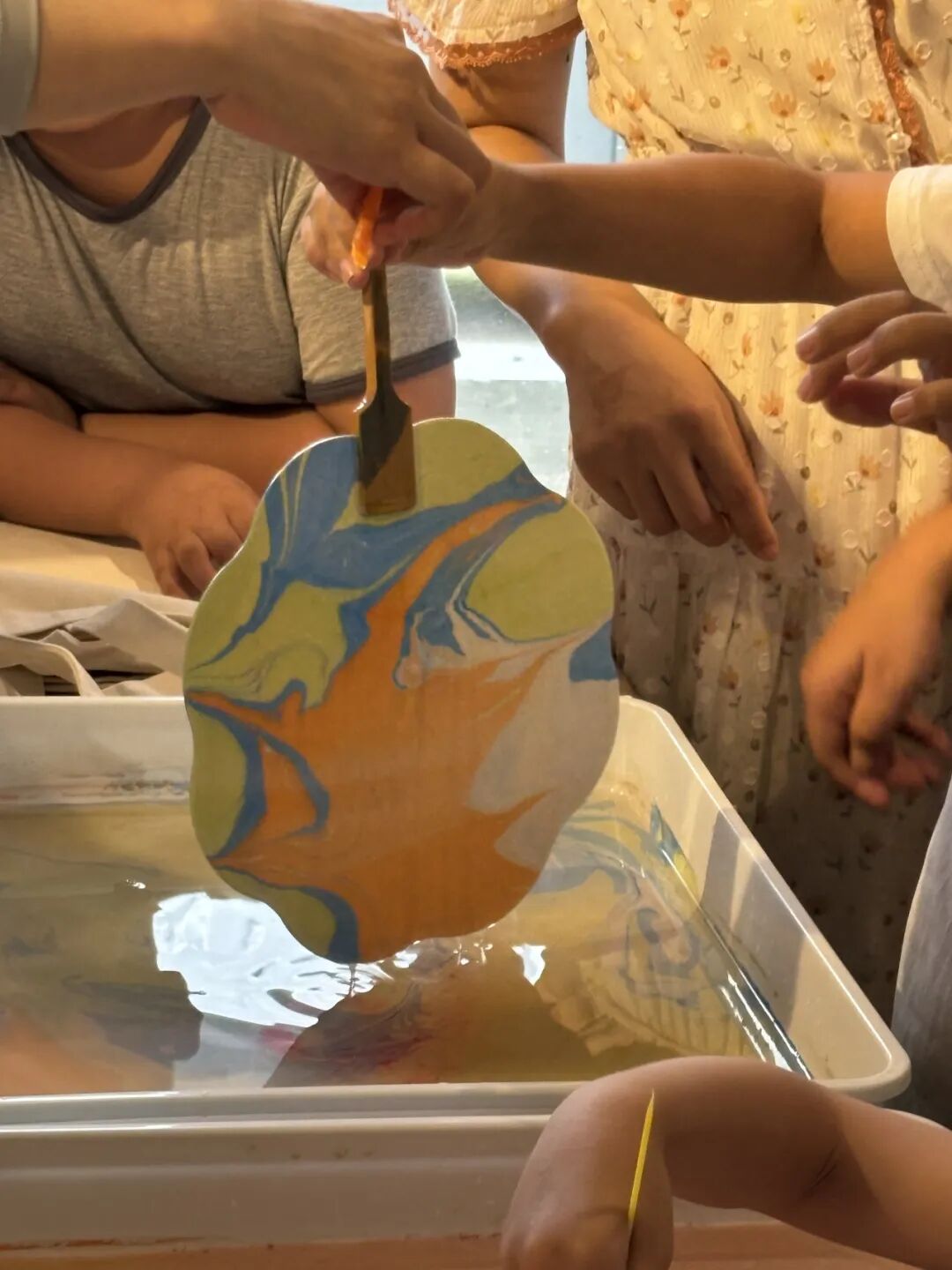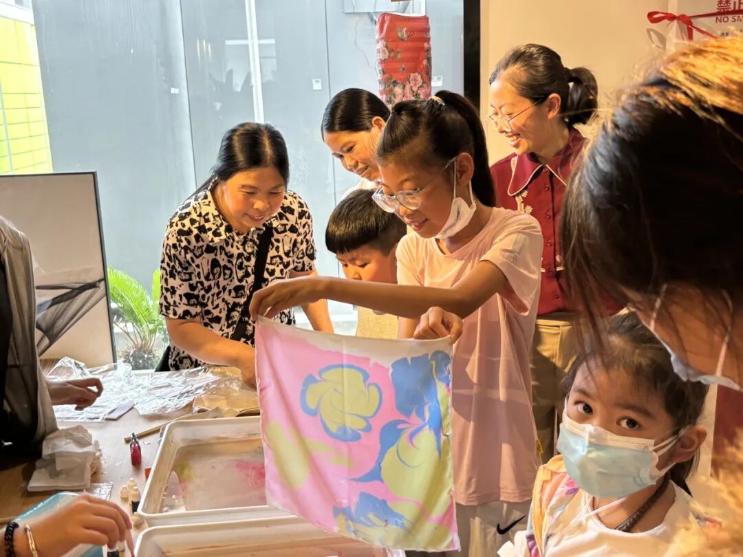 复旦儿科肾脏风湿党支部与护理第五党支部的党员们准备了水拓画和漆扇材料,并且为大家播放了使用教程视频。孩子们和家长都跃跃欲试,在志愿者的帮助下,完成属于自己的帆布包和扇子。