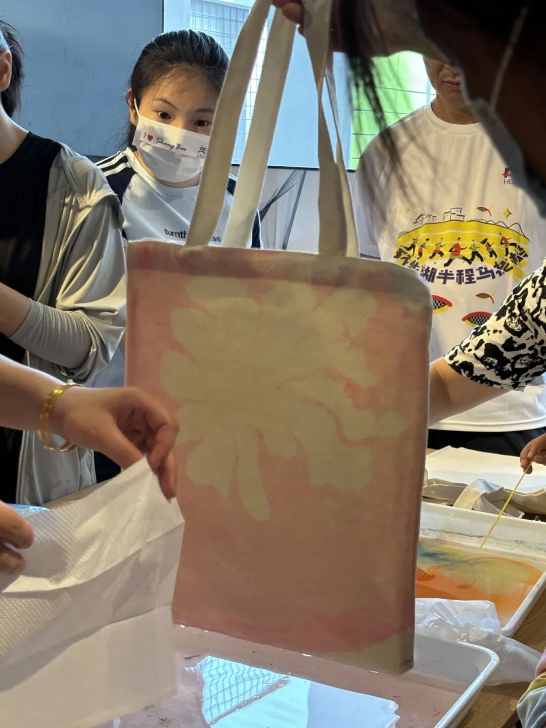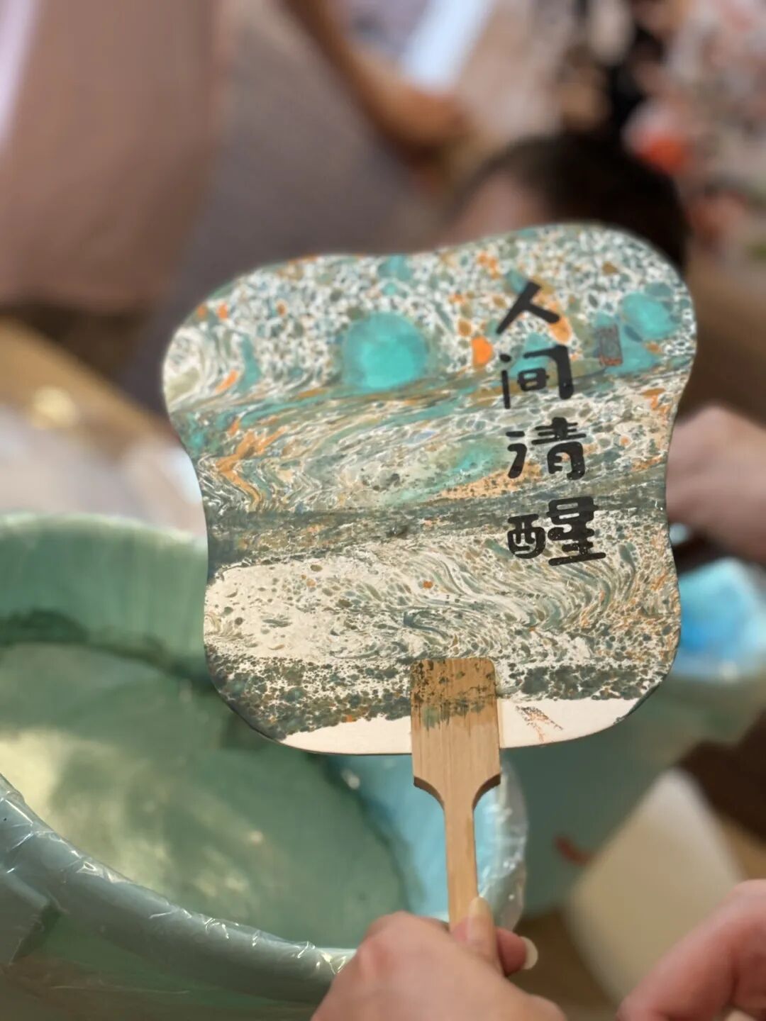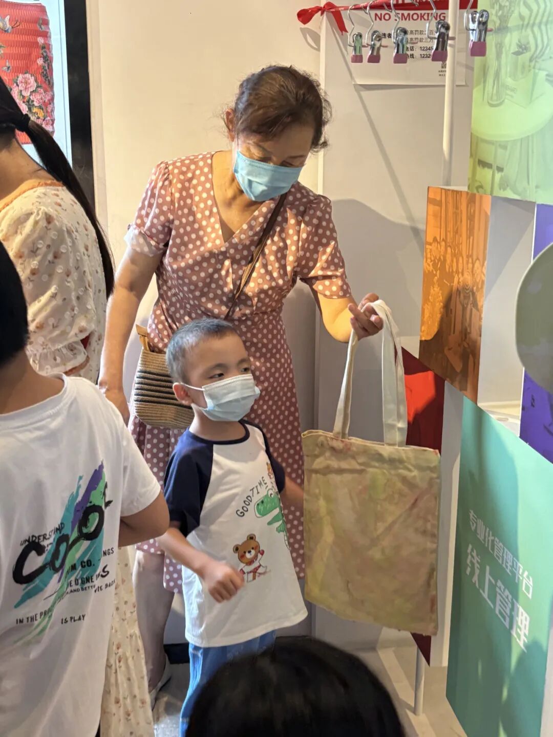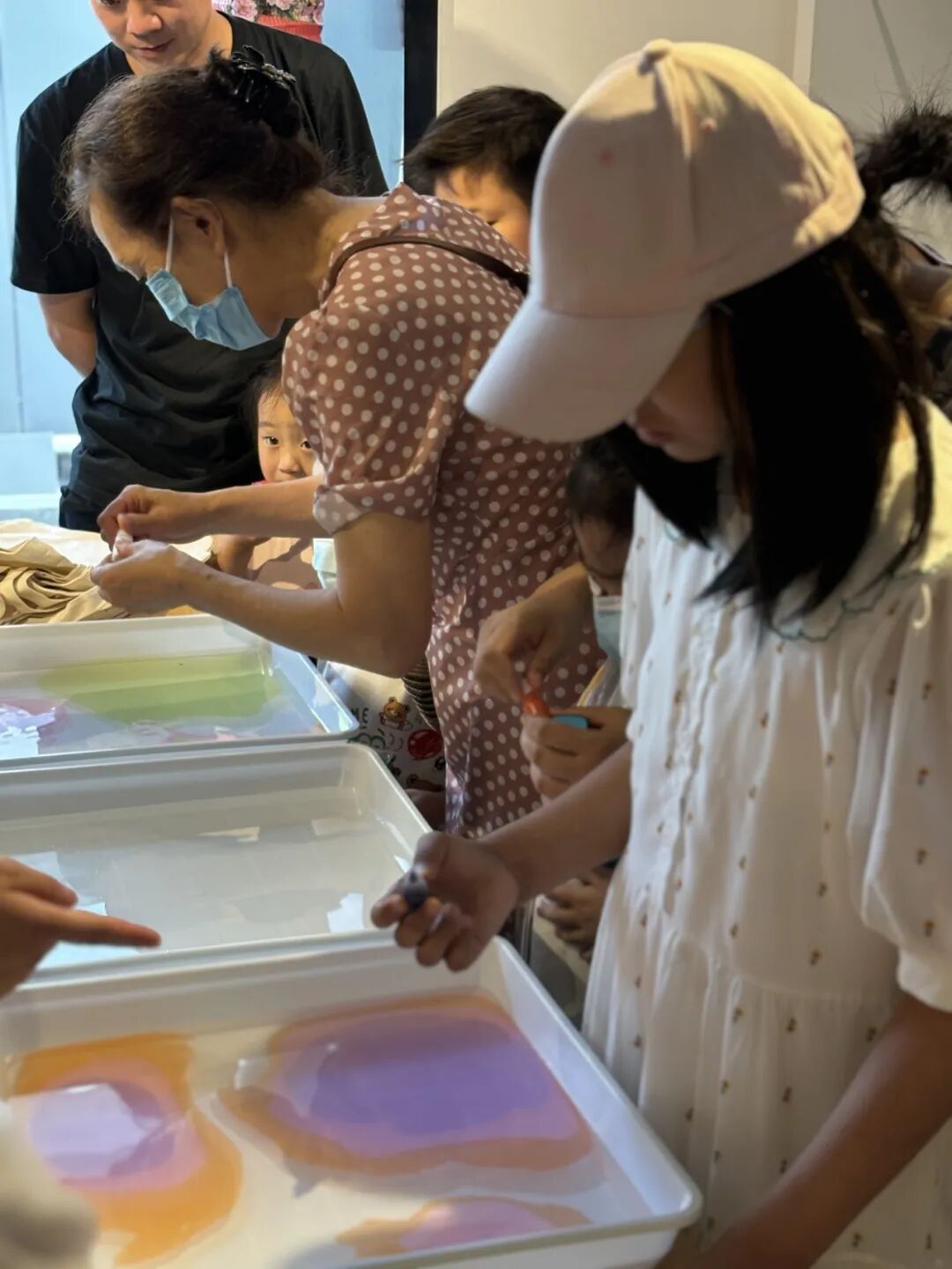 复旦儿科肾脏风湿党支部与护理第五党支部的党员们准备了水拓画和漆扇材料,并且为大家播放了使用教程视频。孩子们和家长都跃跃欲试,在志愿者的帮助下,完成属于自己的帆布包和扇子。